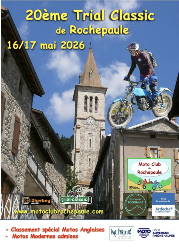 Le MOTO CLUB de ROCHEPAULE organise les 16 et 17 mai 2026, le 20ème Trial CLASSIC de ROCHEPAULE, épreuve FFM n°171, départ et arrivée au Centre Tout Terrain de Rochepaule 07.